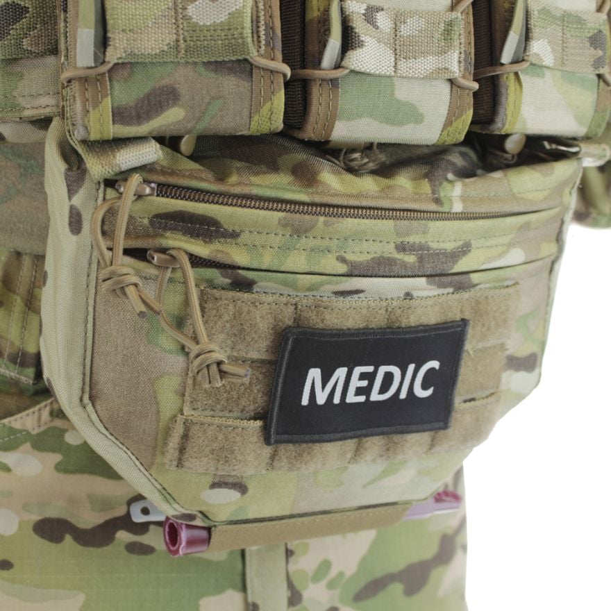 There are 2 zip pockets, the larger and main compartment is designed for storage and quick access of larger accessories and tools, Med Kit and Admin / Maps etc. The smaller pocket is good for storage of smaller items such as torches, batteries, Compass etc. On the underside there are 2 elastic loops for chem lights and or markers. The Drop Down Pouch can also be used as an armour add on for lower abdomen protection, we have included a rear pocket which allows a level 3a soft armour insert to be added. The front of the pouch has 2 rows, each comprising 4 loops of MOLLE webbing with Velcro loop sewn on, ( and an additional row of loop Velcro in between ). This allows the attachment of other small pouches and or call sign and insignia patches. Made from Genuine U.S. Milspec materials, also referred to as a dangler.