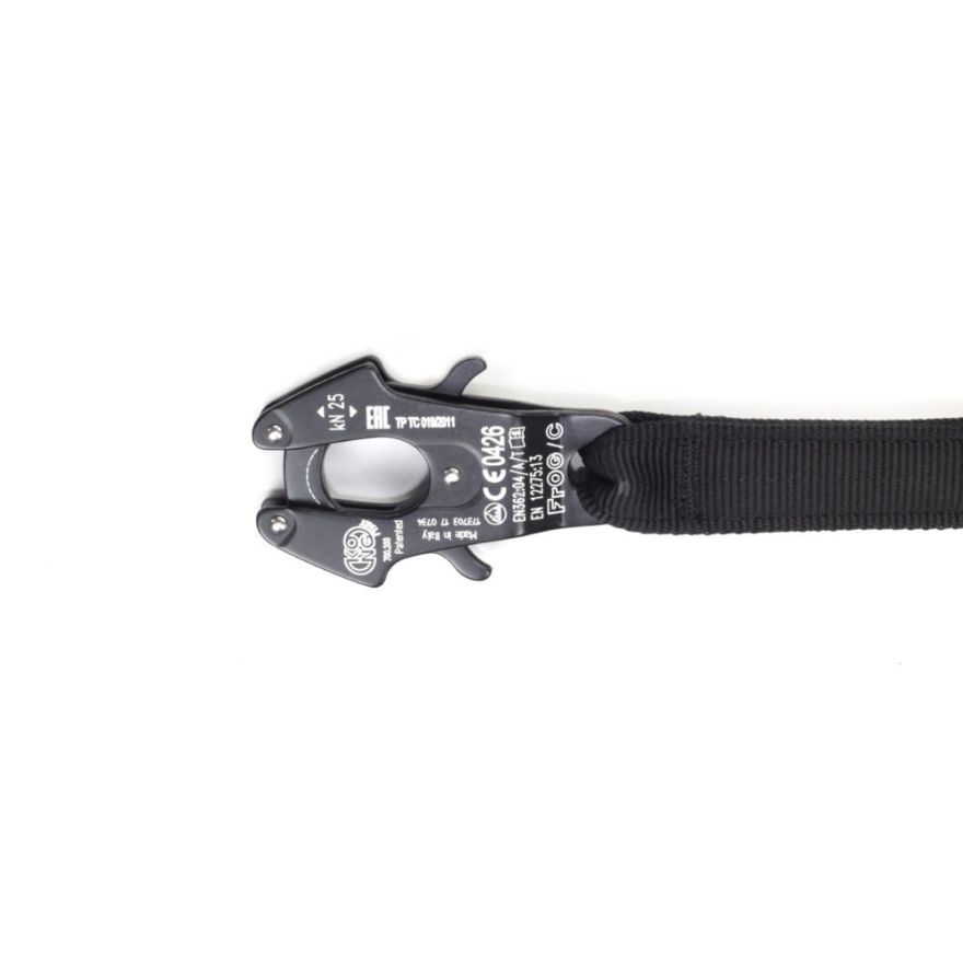 TANGO carabiner has a double gate safety system which prevents accidental opening. FROG clamp has self closing snap on contact with anchor point.