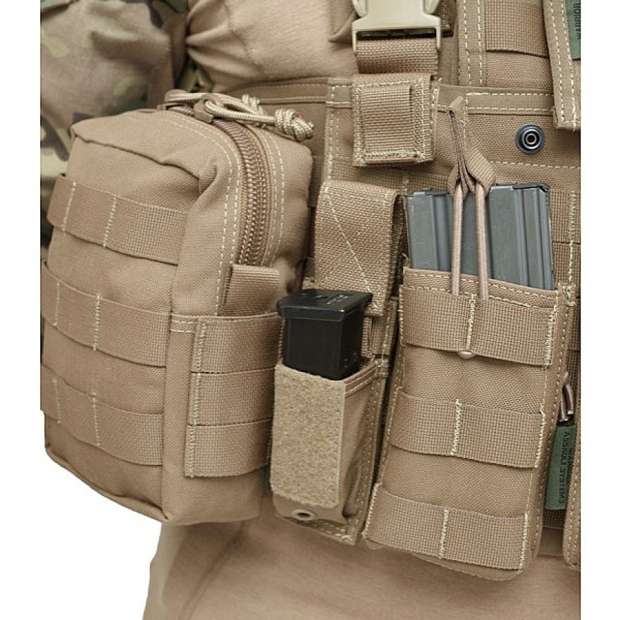 The pouch takes up 1 horizontal row of MOLLE on any compatible plate carrier, chest rig, belt or bag.