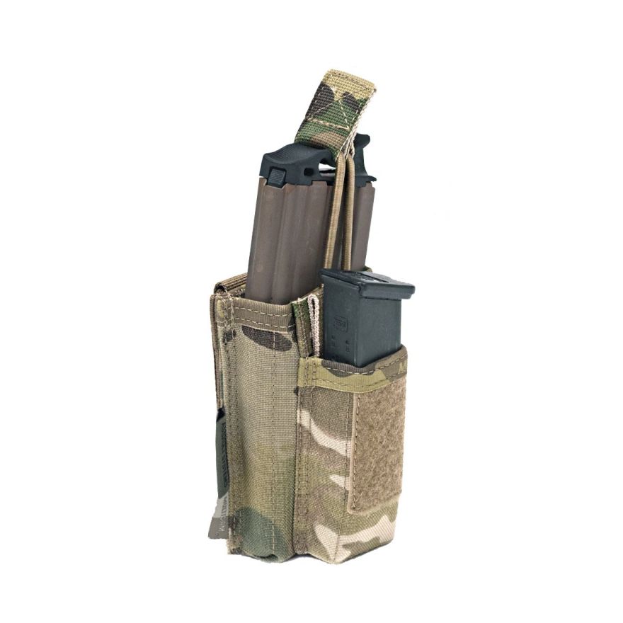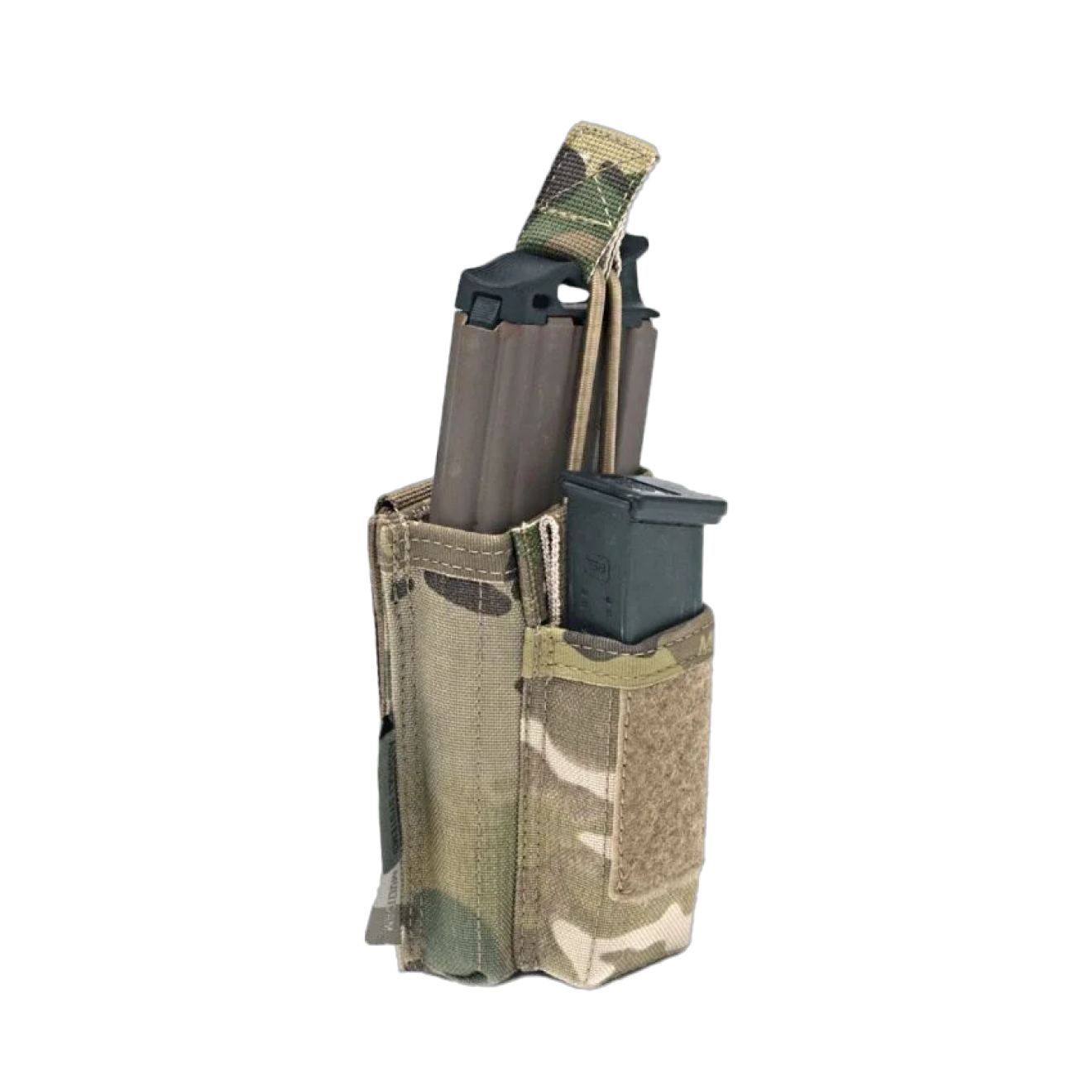 Warrior’s renowned Single Open D.A. 5.56mm is now available with the addition of a 9mm pistol mag pouch attached to the front. This “Kangaroo” pouch holds 5.56mm x 45mm M4 style metal and polymer mags. (NOT G36 mags). The main compartment is accessed via bungee retension with the front pistol mag pouch being accessed via a Velcro lid, this has internal adjustments for height to accommodate varying size mags.